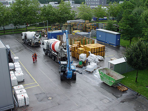 Beton liefern mittels Betonpumpe einbauen und glätten inklusive Hartstoffeinstreuung. Herstellung der Rammsockel und der Rampenausbildung